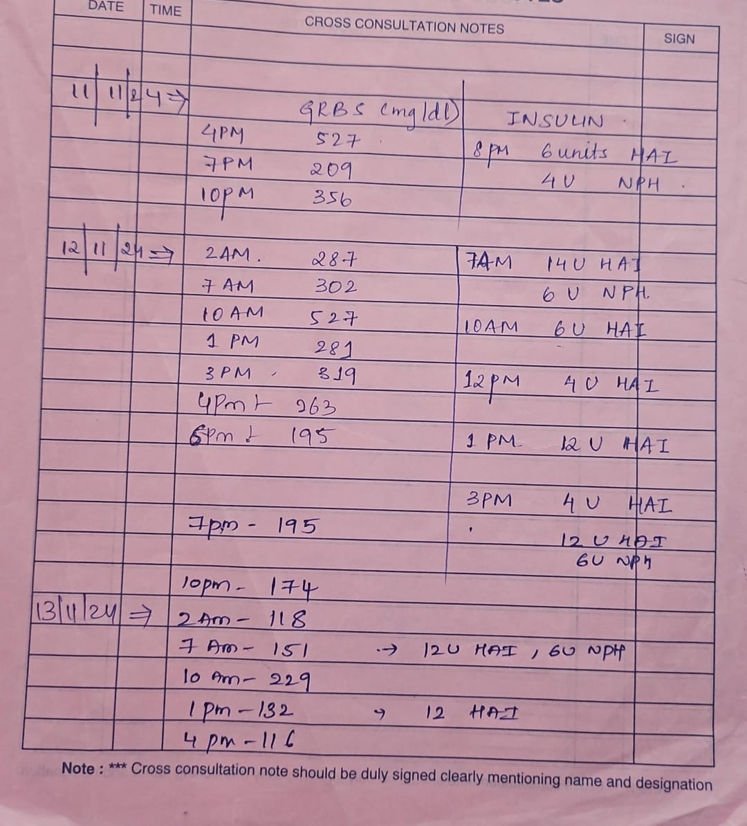 In this case the patient is 59 Yr old female with Diabetes since 10yrs. She is also suffering with Renal failure since 10 months. Since 10 days her blood sugars are uncontrolled and was advised to be admitted in the hospital.