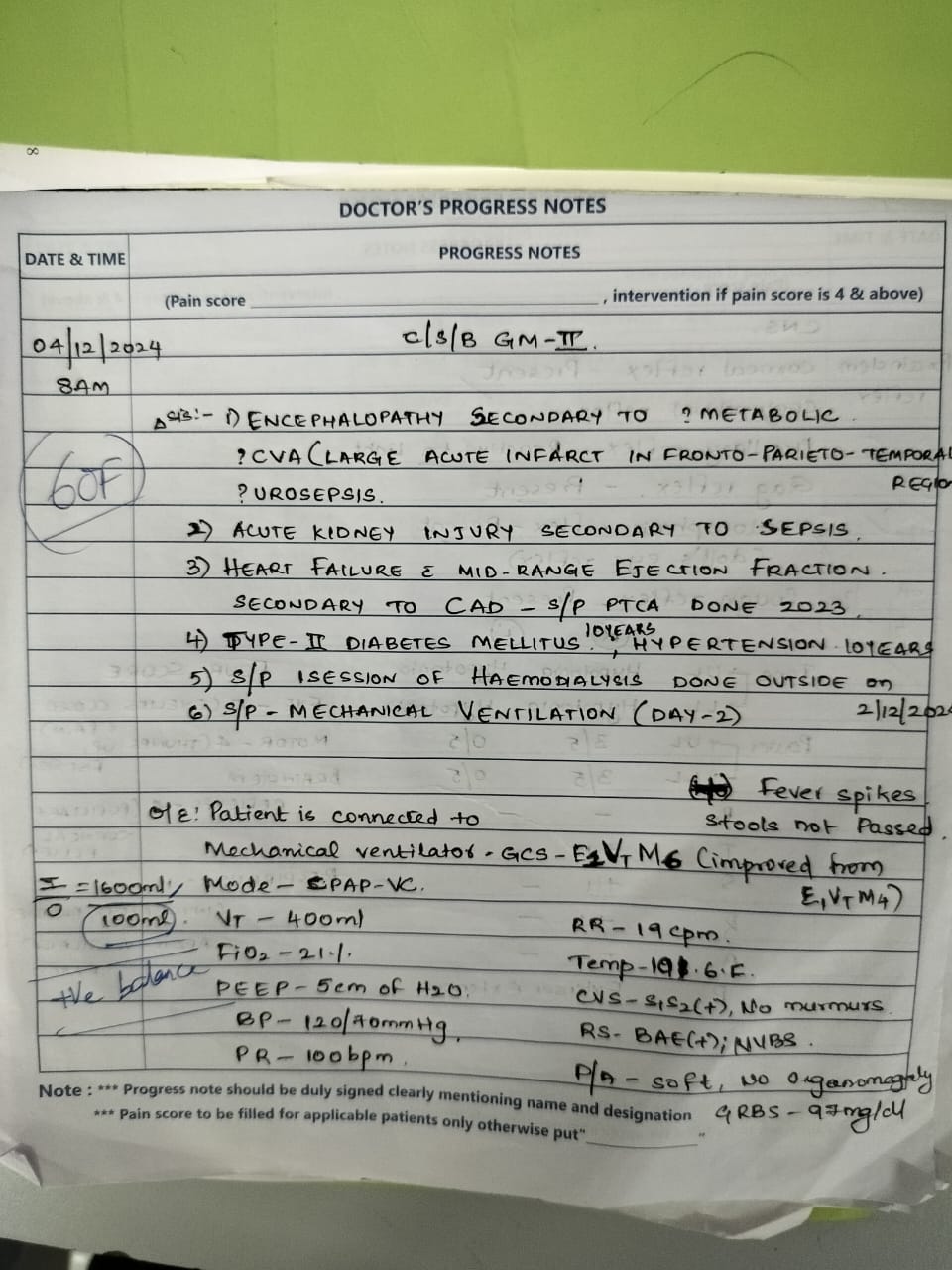 PT WAS MANAGED WITH 2 SESSIONS OF HEMODIALYSIS ON 14TH AND 15/12/24, DIURETICS, IV ANTIBIOTICS, BETA BLOCKERS, ANTI PLATELETS, ANTI HYPERTENSIVES.